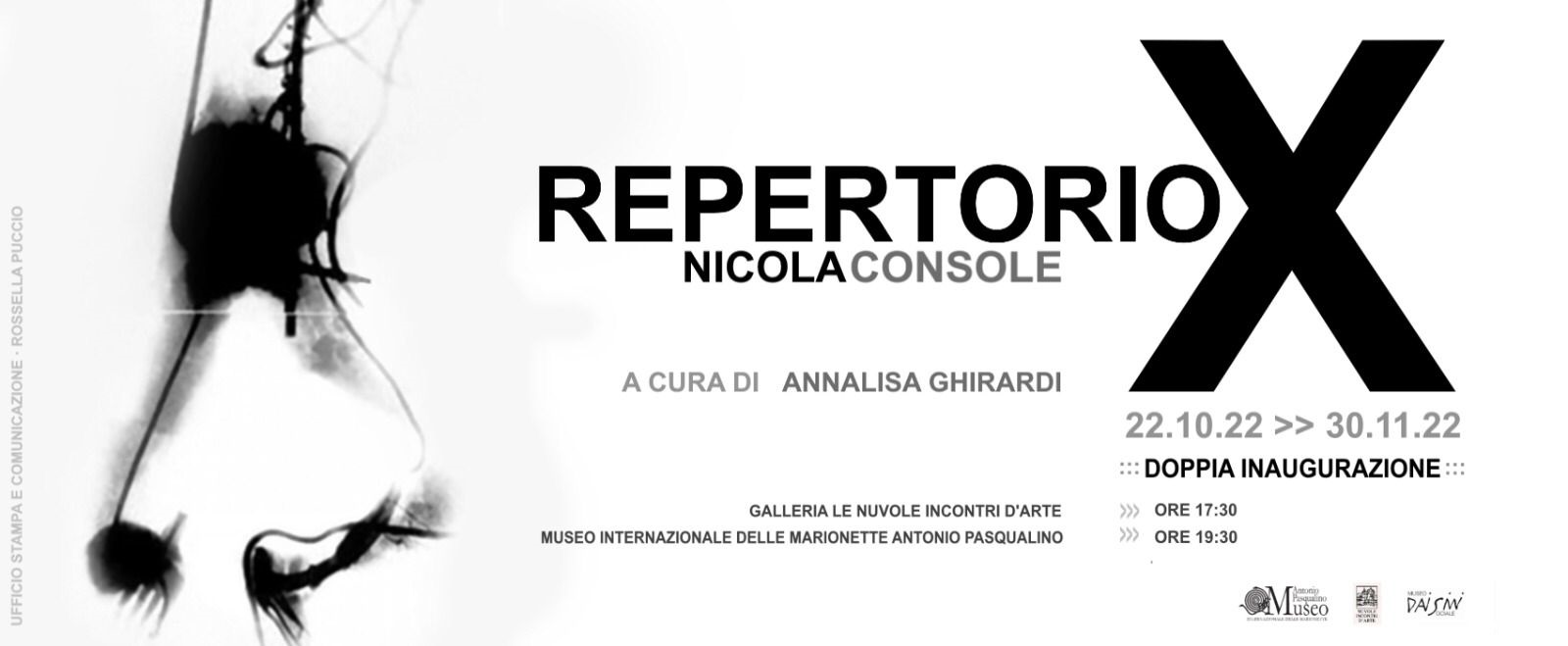 L’esposizione prenderà il via sabato 22 con una doppia inaugurazione: alle 17,30 nella Galleria Nuvole Arte e alle 19,30 nel Museo delle Marionette. Saranno in mostra disegni, sculture, installazioni, tre film di animazione in stop motion e inedite opere radiografiche realizzate da Console negli ultimi due anni. Attraverso singolari riflessioni sulla scultura, tra dolore e denuncia, trasparenze e inquietudine, “Repertorio X – si legge in una nota – tratta il sentimento della perdita e del distacco, l’idea di catastrofe ovvero l’inevitabile cui l’umanità si approssima”.