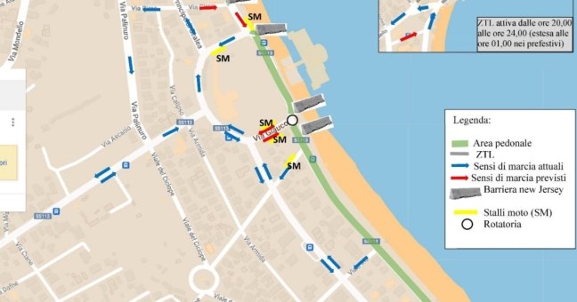 La segnaletica è stata posizionata e fino al 30 settembre scatteranno le isole a intermittenza: in viale Regina Elena sarà lasciata una corsia di sei metri per le automobili tra via Glauco e via Anadiomene, con l’area pedonale lato mare, e in via Glauco il senso di marcia sarà unico verso viale Regina Elena.