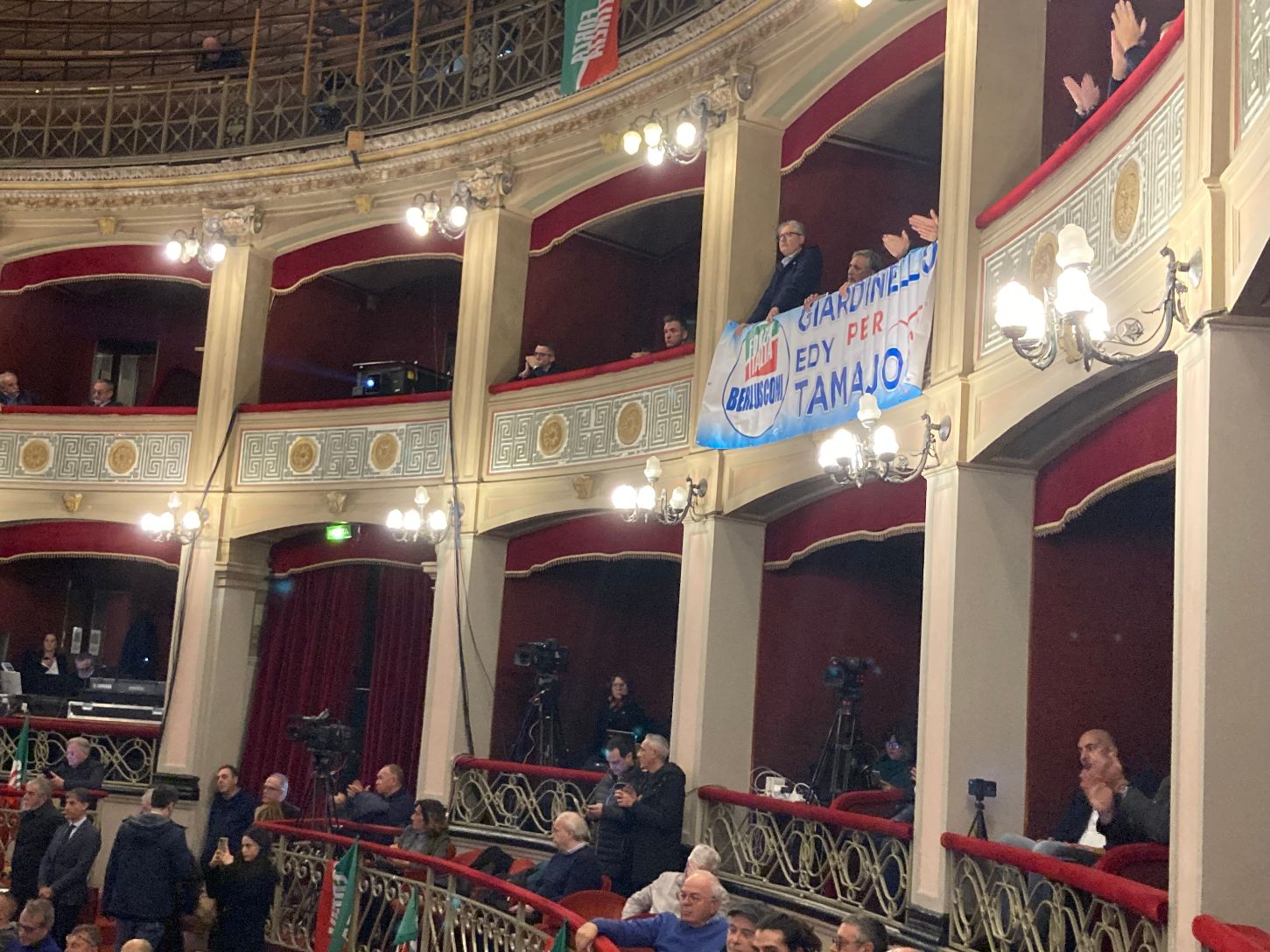 Teatro gremito. Le folle oceaniche dei tempi di Silvio Berlusconi erano altra cosa ma il Politeama viene comunque occupato in ogni ordine di posti. L’assessore regionale alle Attività produttive, Edy Tamajo, si guarda intorno soddisfatto e saluta con un cenno lo striscione “Giardinello per Edy Tamajo” affisso da uno dei palchetti.