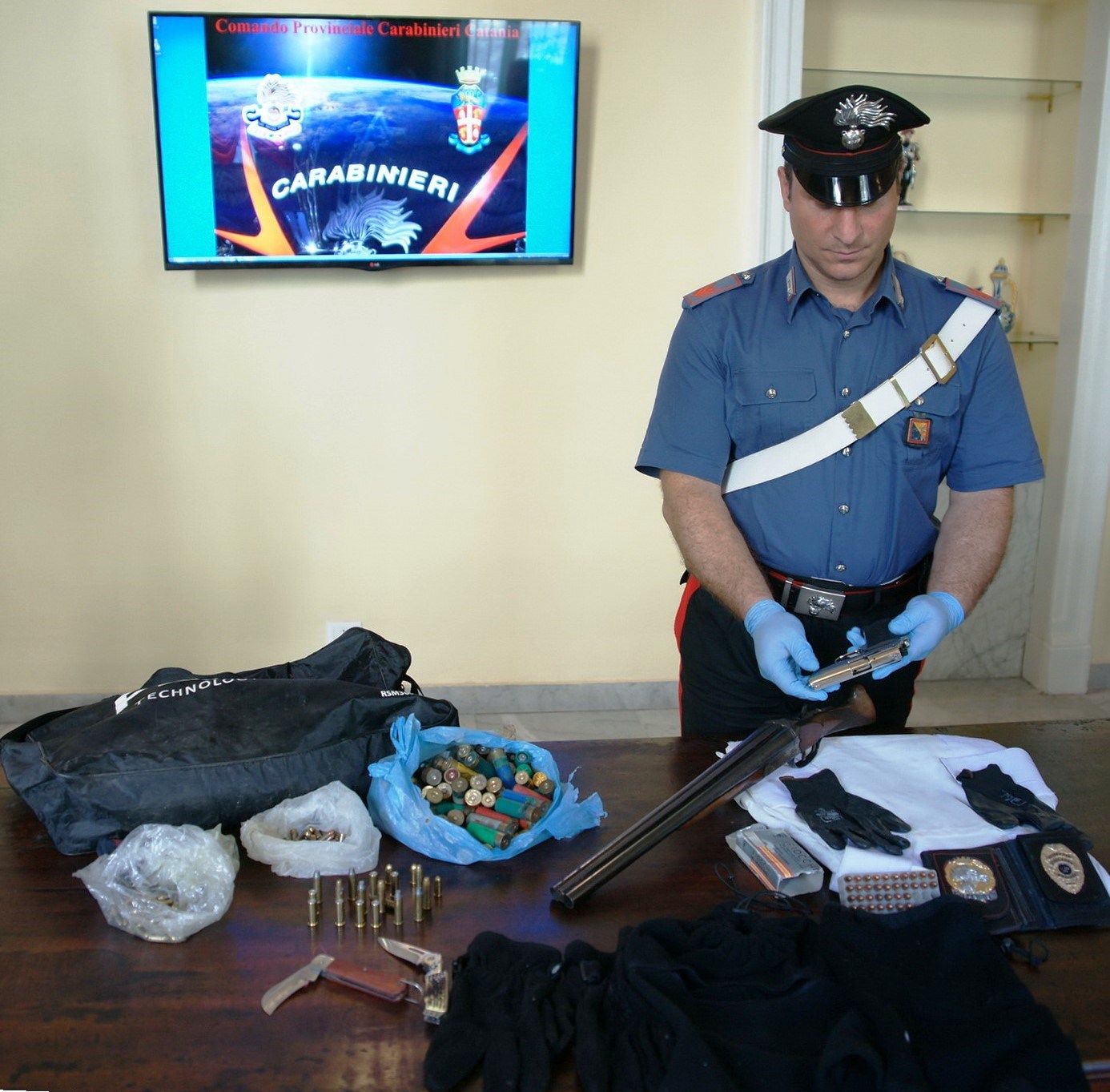 Per la precisione sono state sequestrate: 1 fucile da caccia marca Zanoletti, cal. 16, con canne mozzate, risultato rubato ad Aci S. Antonio (CT) nel Settembre 2011; 1 pistola giocattolo marca “New Police”, cal. 8, con canna priva di tappo rosso; 244 munizioni di vario calibro; 1 giubbetto antiproiettile; 2 distintivi di riconoscimento, del tipo utilizzato dalle forze dell’ordine (uno riproducente quello dei “carabinieri”), 2 coltelli a serramanico ed alcuni passamontagna.