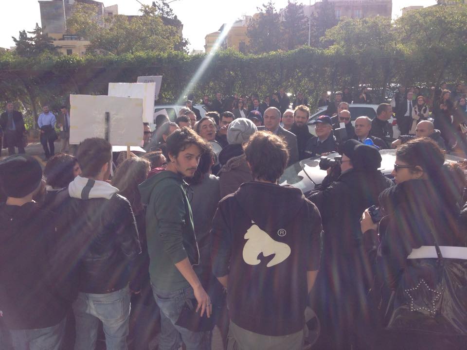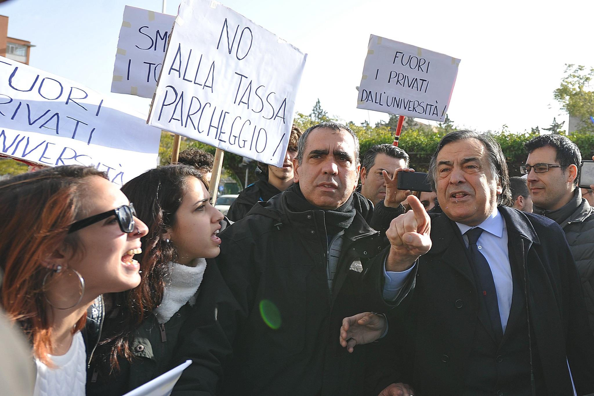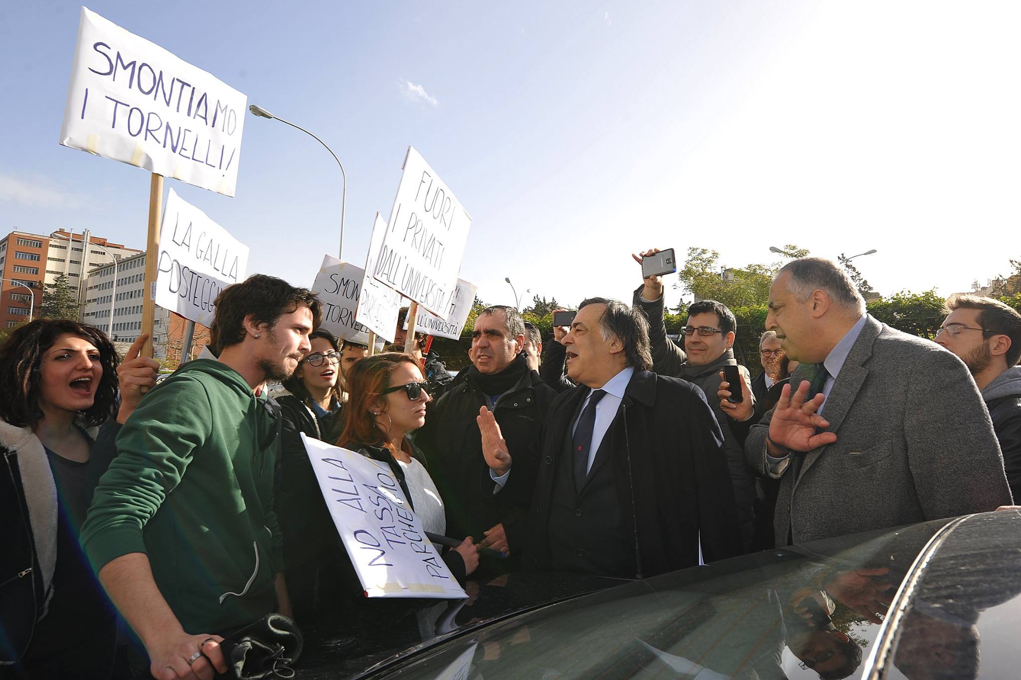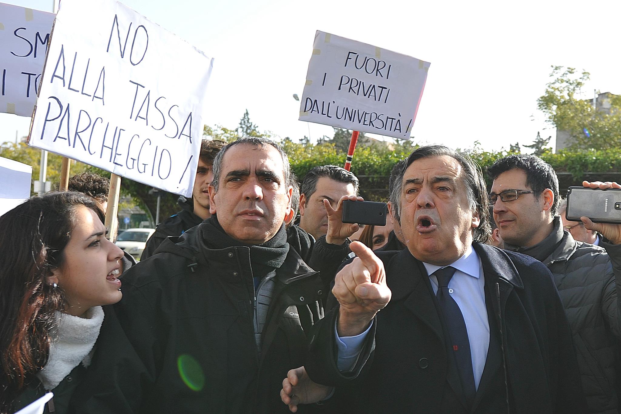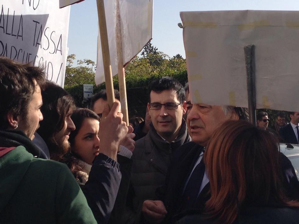 Un gruppo di studenti, con cartelli e megafono, ha inscenato una protesta durante la cerimonia di inaugurazione contestando i parcheggi a pagamento e le tasse universitarie considerate troppo elevate.
