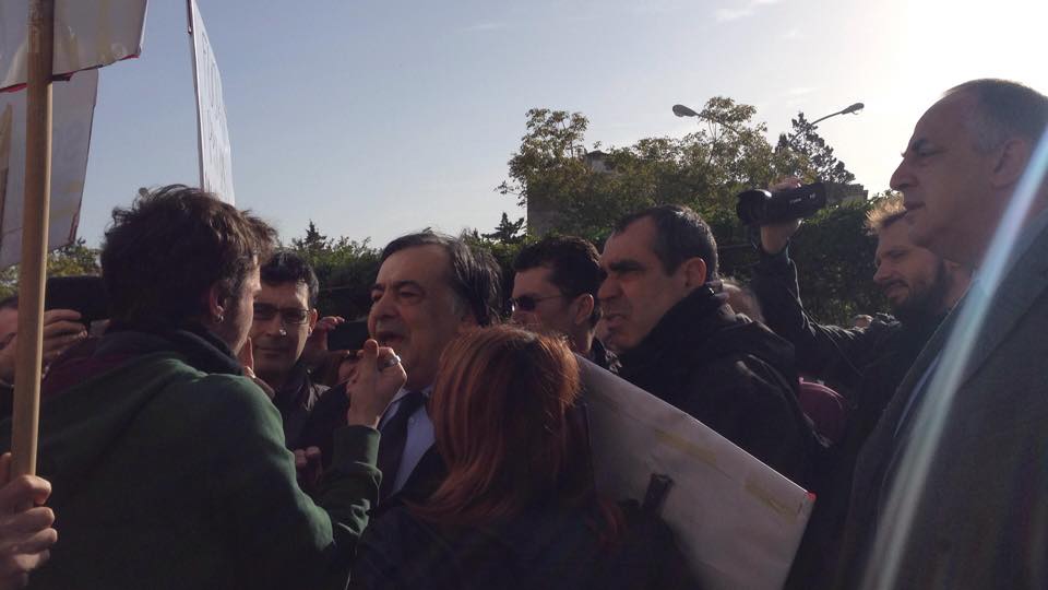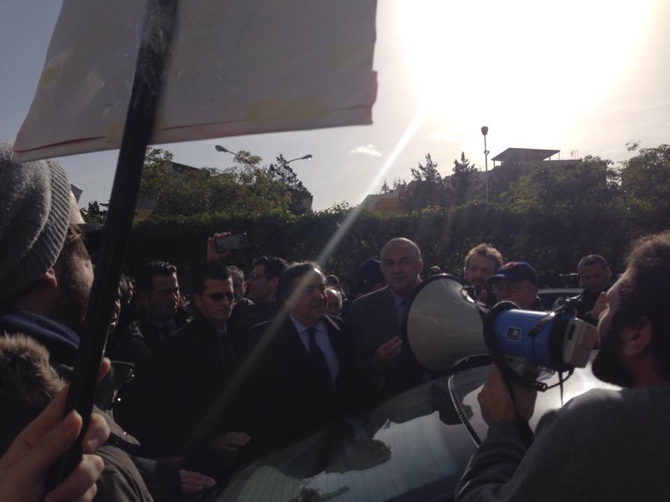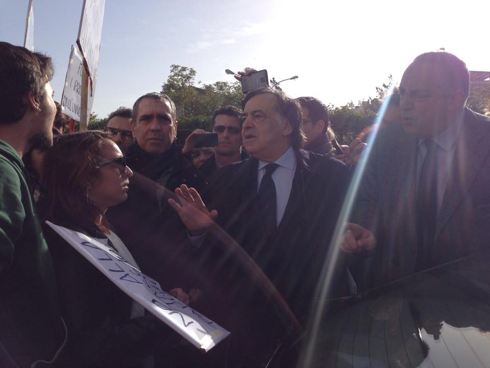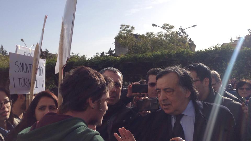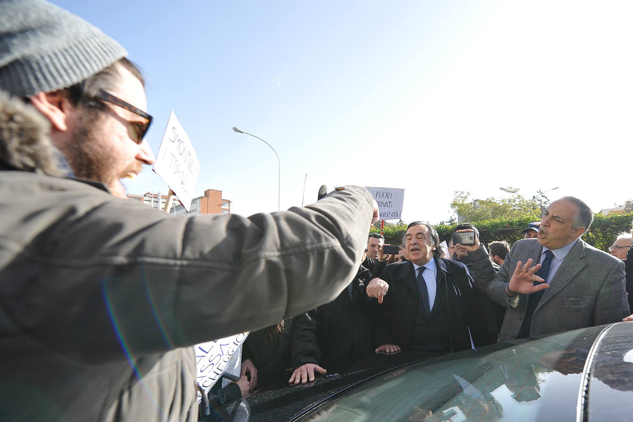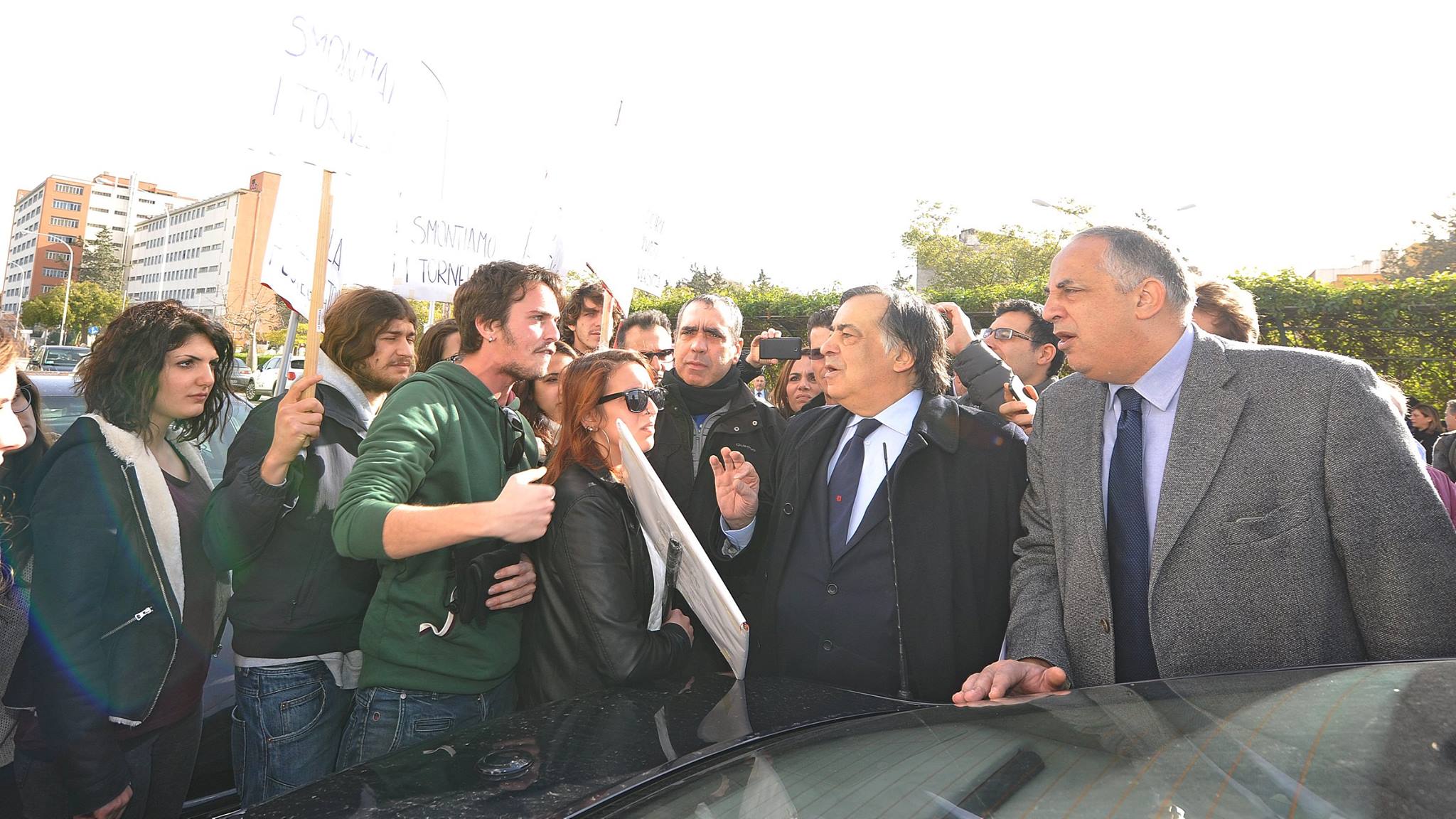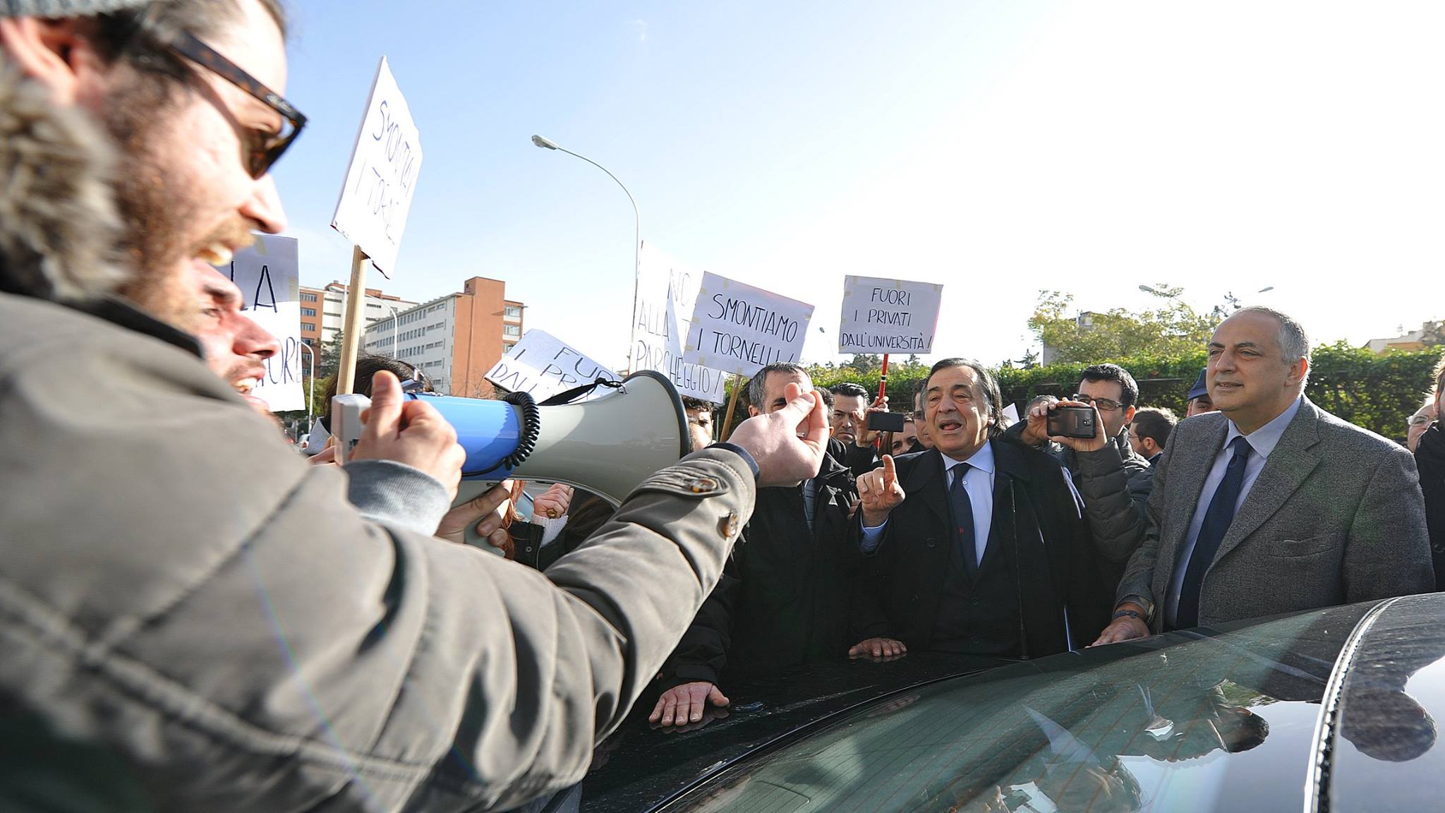 Un gruppo di studenti, con cartelli e megafono, ha inscenato una protesta durante la cerimonia di inaugurazione contestando i parcheggi a pagamento e le tasse universitarie considerate troppo elevate.