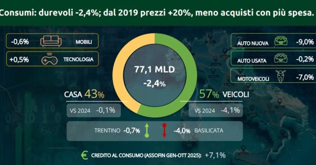 ROMA (ITALPRESS) – Dopo due anni di crescita il motore dei beni durevoli si ferma: a fine 2025 il comparto segnerà consumi in calo del 2,3% in volume e del 2,4% in valore, per una spesa complessiva che da 79 miliardi scivola a 77,1 miliardi. E’ la fotografia scattata dal 32° Osservatorio Findomestic, realizzato insieme a Prometeia, per un mercato che resta comunque su livelli più alti rispetto al pre-Covid, non per un aumento dei volumi acquistati ma esclusivamente per l’incremento dei prezzi che in 6 anni sfiora il 20%. A determinare il segno meno è soprattutto la mobilità, il segmento che da solo vale il 57% della spesa delle famiglie in beni durevoli. Qui la frenata è evidente, con le auto nuove in calo del 9% a valore. La casa – mobili e tecnologia – resta invece impantanata in una stagnazione che dura dal 2023, dopo gli exploit del triennio post-pandemico. Sul fronte territoriale, le tre locomotive storiche – Lombardia, Lazio e Veneto – perdono tra il 2,6 e il 2,8%. Resiste meglio l’Emilia-Romagna (-1,8%), che quasi aggancia il podio nella graduatoria per volumi di spesa.