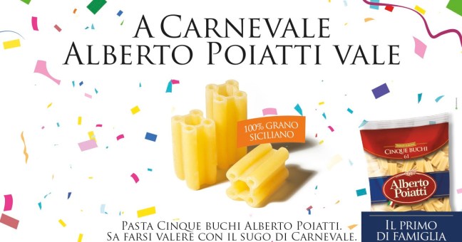 Non è Carnevale, senza portare in tavola un buon piatto di Pasta Alberto Poiatti ”Cinque buchi”, capace com’è, per il suo formato e la sua callosità, di catturare al suo interno il sapore del ragù tipico della festa più divertente ed esagerata dell’anno.