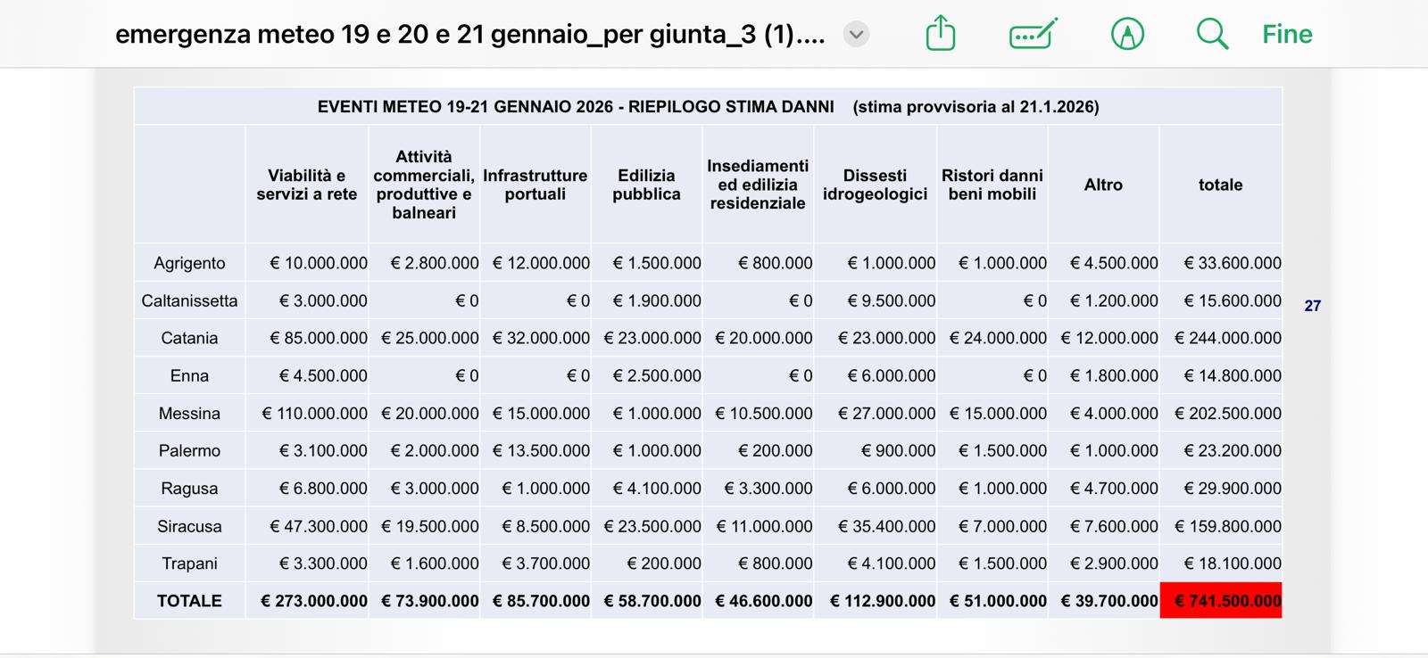 Subito dopo arriva la comunicazione sulla prima stima dei danni effettuata dal dipartimento regionale di Protezione civile, diretto da Salvo Cocina: 741,5 milioni di euro. Una cifra che non tiene conto in questo momento dei danni subiti dalle imprese e dalle attività commerciali. “Il sistema di preallerta ha funzionato, non ci sono stati danni alle persone“, ricorda il governatore.