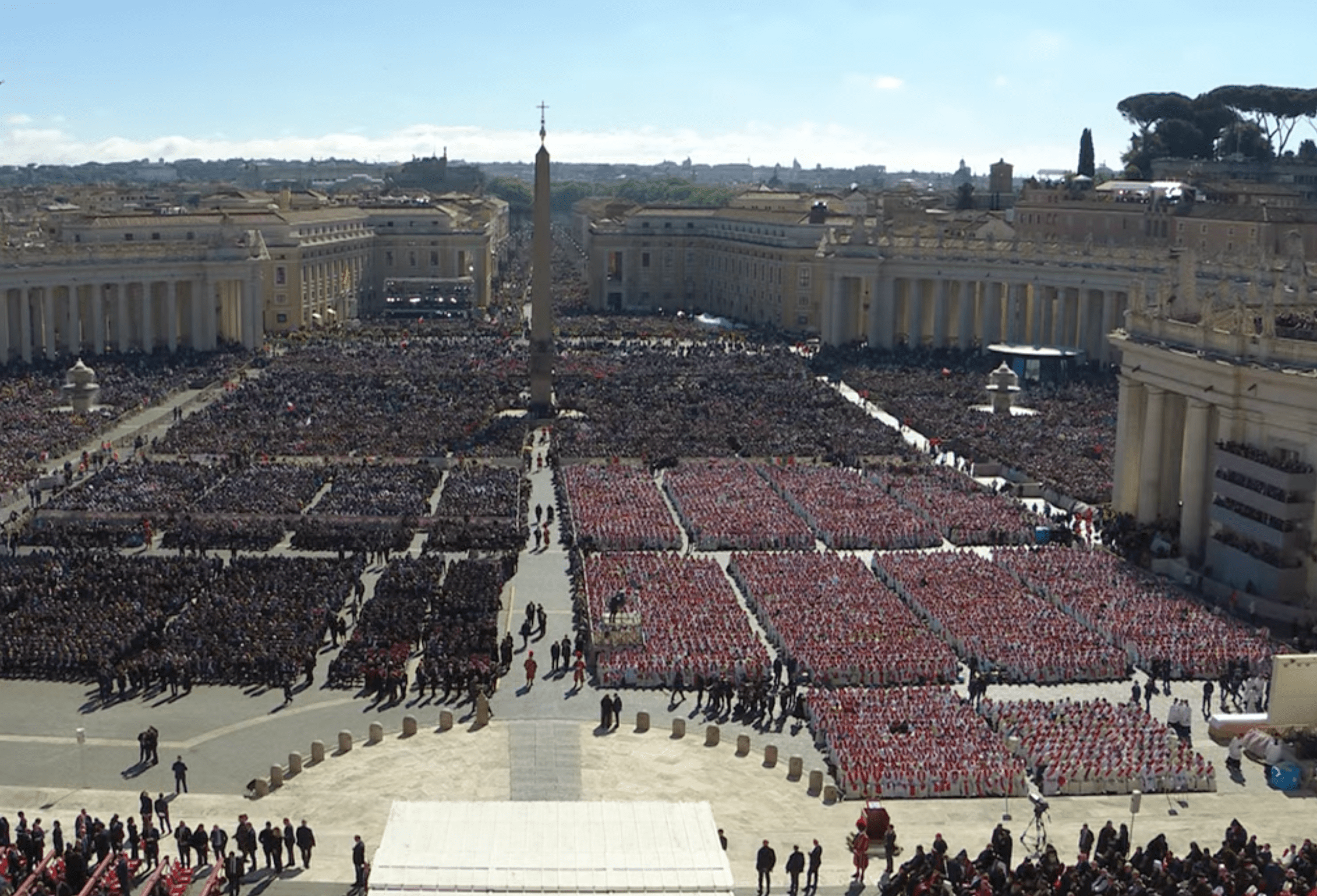 Per permettere a tutti i presenti di vedere la cerimonia sono stati allestiti cinque maxi schermi a piazza San Pietro, due sotto al sagrato, altri due ai lati del colonnato e uno prima di via della Conciliazione.