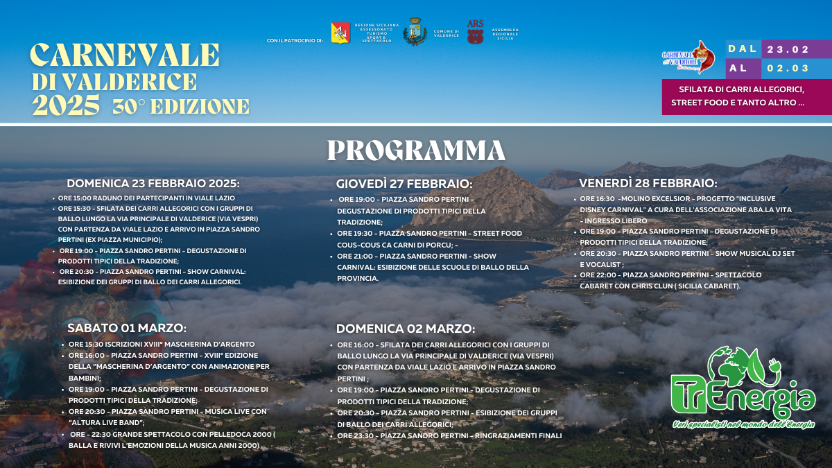 Dal 23 febbraio al 2 marzo, Valderice si trasformerà in un palcoscenico a cielo aperto. Si parte domenica 23 febbraio con la prima grande sfilata dei carri allegorici e dei gruppi di ballo, un evento che attira ogni anno un grande quantità di spettatori.