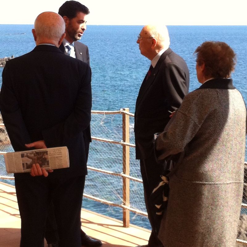 Gli scatti di alcune pietanze della cena "per pochi intimi" del 25 febbraio alla Baia Verde, con rispettiva "mise en place" della tavola. Napolitano con la moglie Clio sulla terrazza che si affaccia sullo splendido golfo di Catania, con lui l'amministratore dell'albergo, Nico Torrisi.