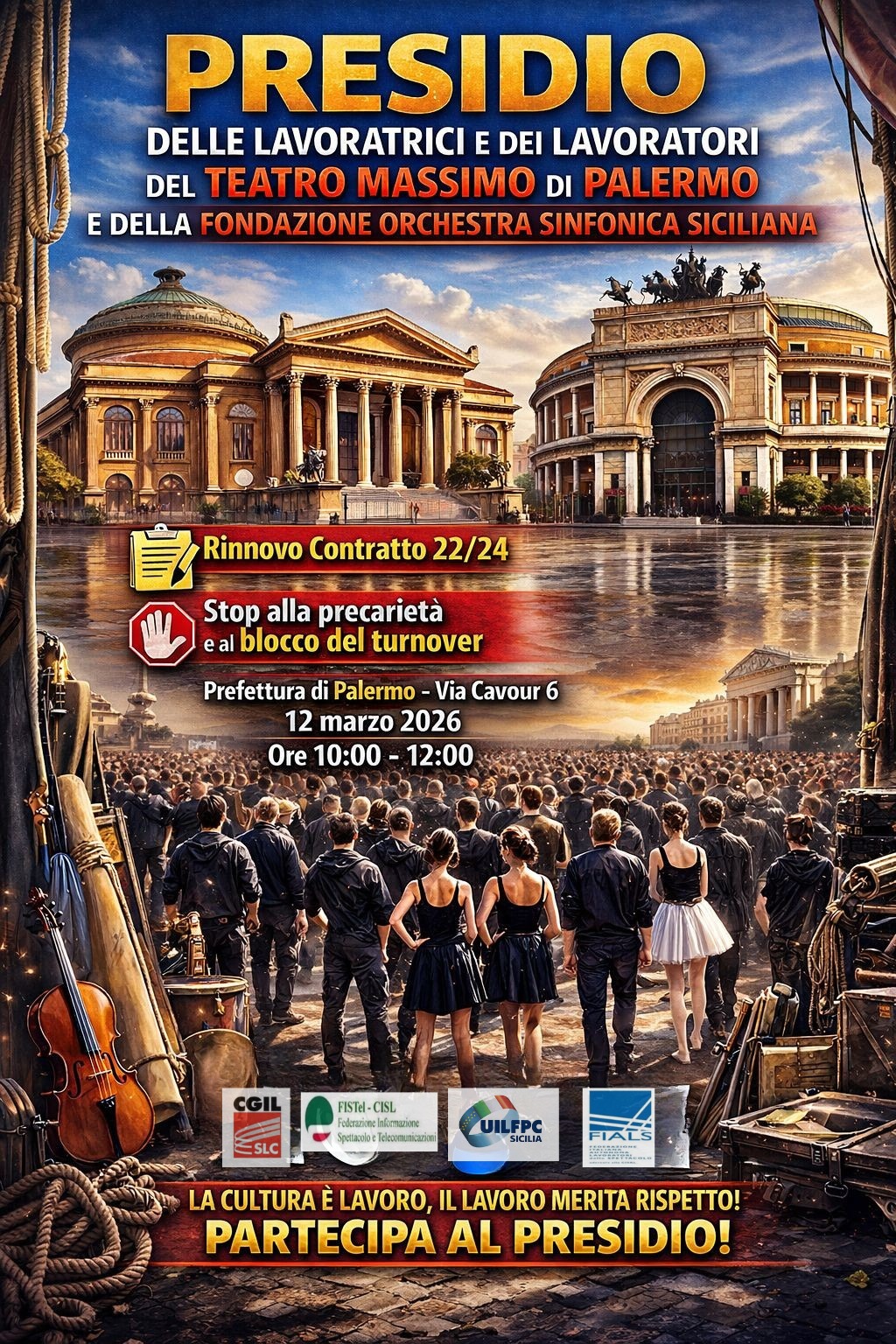 A Palermo, il presidio del 12 marzo sarà l’occasione per consegnare al prefetto un documento che illustra le ragioni della vertenza e per chiedere un intervento delle istituzioni affinché si apra finalmente un confronto serio sul futuro del settore. Le lavoratrici e i lavoratori della Fondazione Teatro Massimo e della Fondazione Orchestra Sinfonica Siciliana, insieme alle organizzazioni sindacali, chiedono “risposte immediate, il rinnovo del contratto nazionale e politiche che garantiscano stabilità occupazionale, adeguate risorse e il riconoscimento del valore del lavoro culturale”.