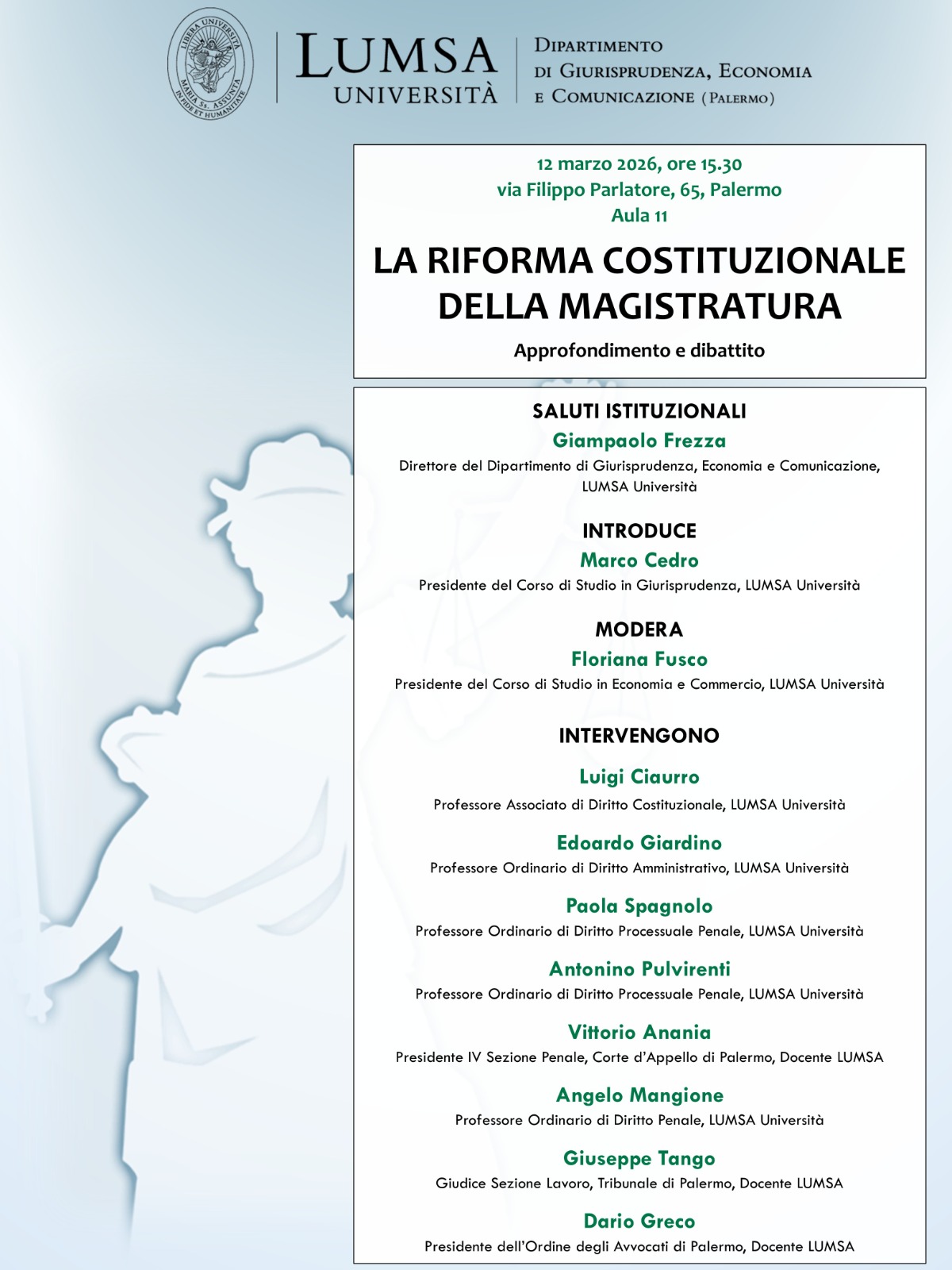 Animeranno la tavola rotonda gli interventi di Luigi Ciaurro, Professore Associato di Diritto Costituzionale presso l’Università LUMSA, Edoardo Giardino, Professore Ordinario di Diritto Amministrativo presso l’Università LUMSA, Paola Spagnolo, Professoressa Ordinaria di Diritto Processuale Penale e Prorettrice alla Didattica e al Diritto allo Studio presso l’Università LUMSA, Antonino Pulvirenti, Professore Ordinario di Diritto Processuale Penale presso l’Università LUMSA, Vittorio Anania, Presidente della IV Sezione Penale della Corte d’Appello di Palermo e docente a contratto presso l’Università LUMSA, Angelo Mangione, Professore Ordinario di Diritto Penale presso l’Università LUMSA, Giuseppe Tango, giudice presso la sezione lavoro del Tribunale di Palermo e docente a contratto presso l’Università LUMSA, Dario Greco, Presidente dell’Ordine degli Avvocati di Palermo e docente a contratto presso l’Università LUMSA.