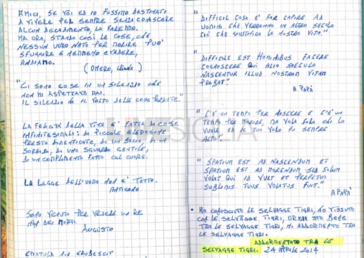 Per anni, ad ogni anniversario della morte di Francesco Messina Denaro, sul Giornale di Sicilia spuntava un necrologio in ricordo del padre del boss latitante. Le stesse frasi sono riportate in una pagina del diario: “C’è un tempo per nascere e c’è un tempo per morire, ma vola soltanto colui che vuole ed il tuo volo fu sempre sublime”.