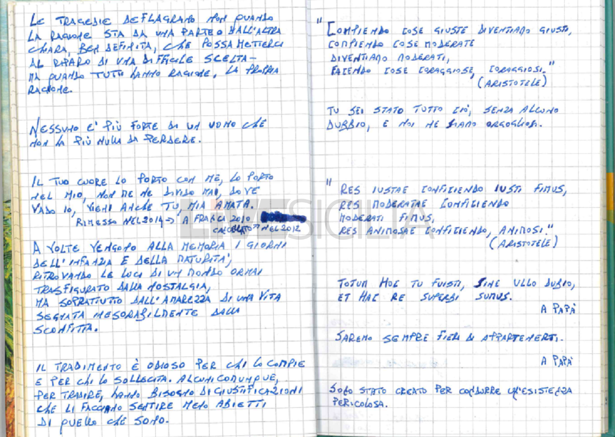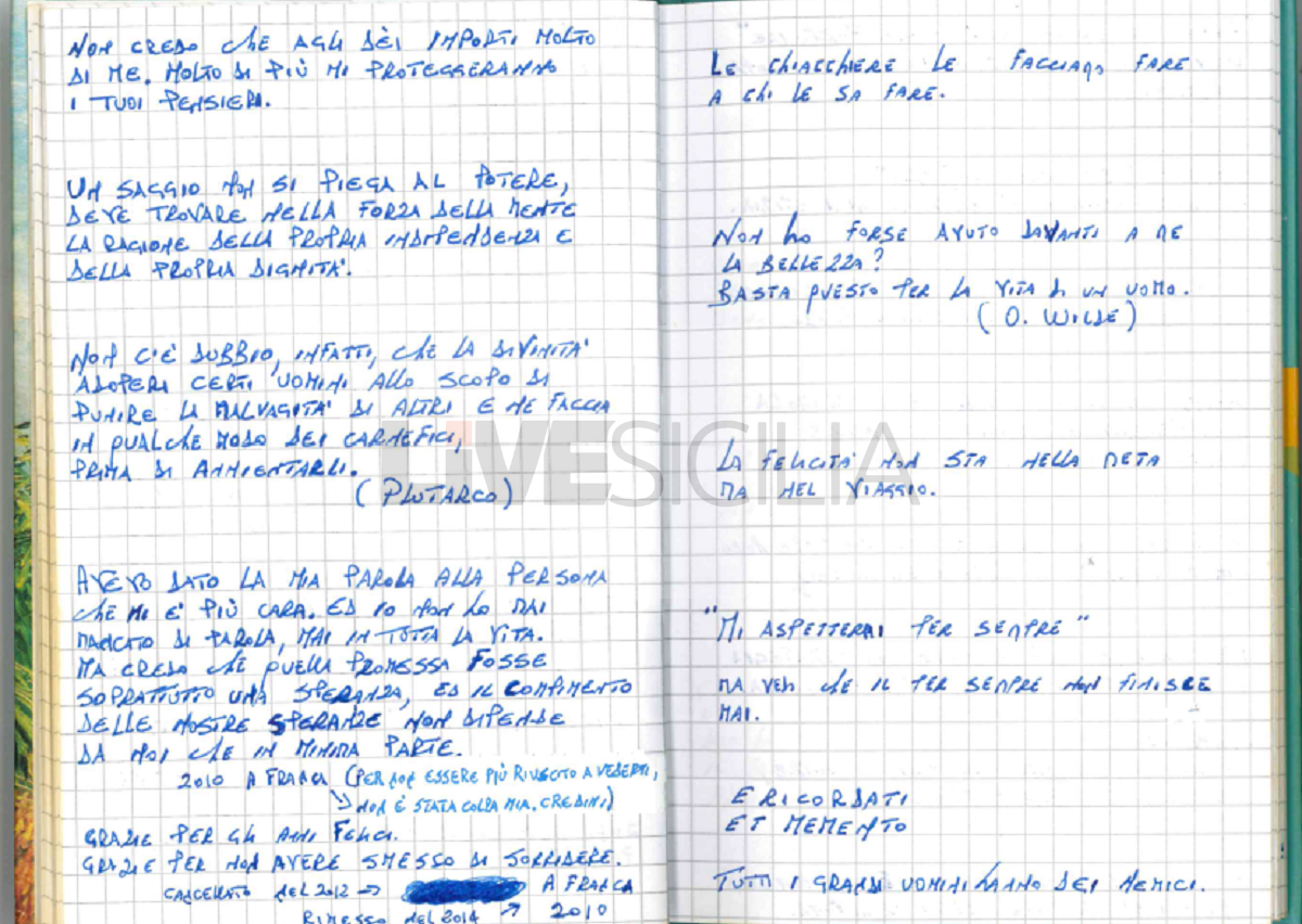 Molti pensieri sono dedicati alla donna che lo ha reso padre. “Mi spiace solo pensare che non potrò più guardarti, mentre agli altri sarà ancora permesso”. Così scriveva nel 2008. Un pensiero “cancellato nel 2012” e “rimesso nel 2014”.