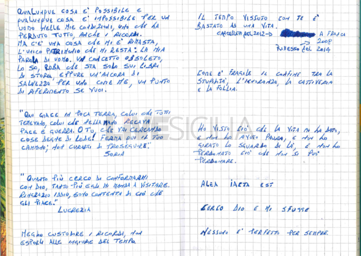 Anche questo ritornare sui propri passi è annotato con cura. D’altra parte il rapporto con Franca Alagna è segnato da sentimenti altalenanti. La ringrazia per essere stata la donna “che ha dato un senso alla mia vita”, il cuore appartiene per sempre “a Franca”.