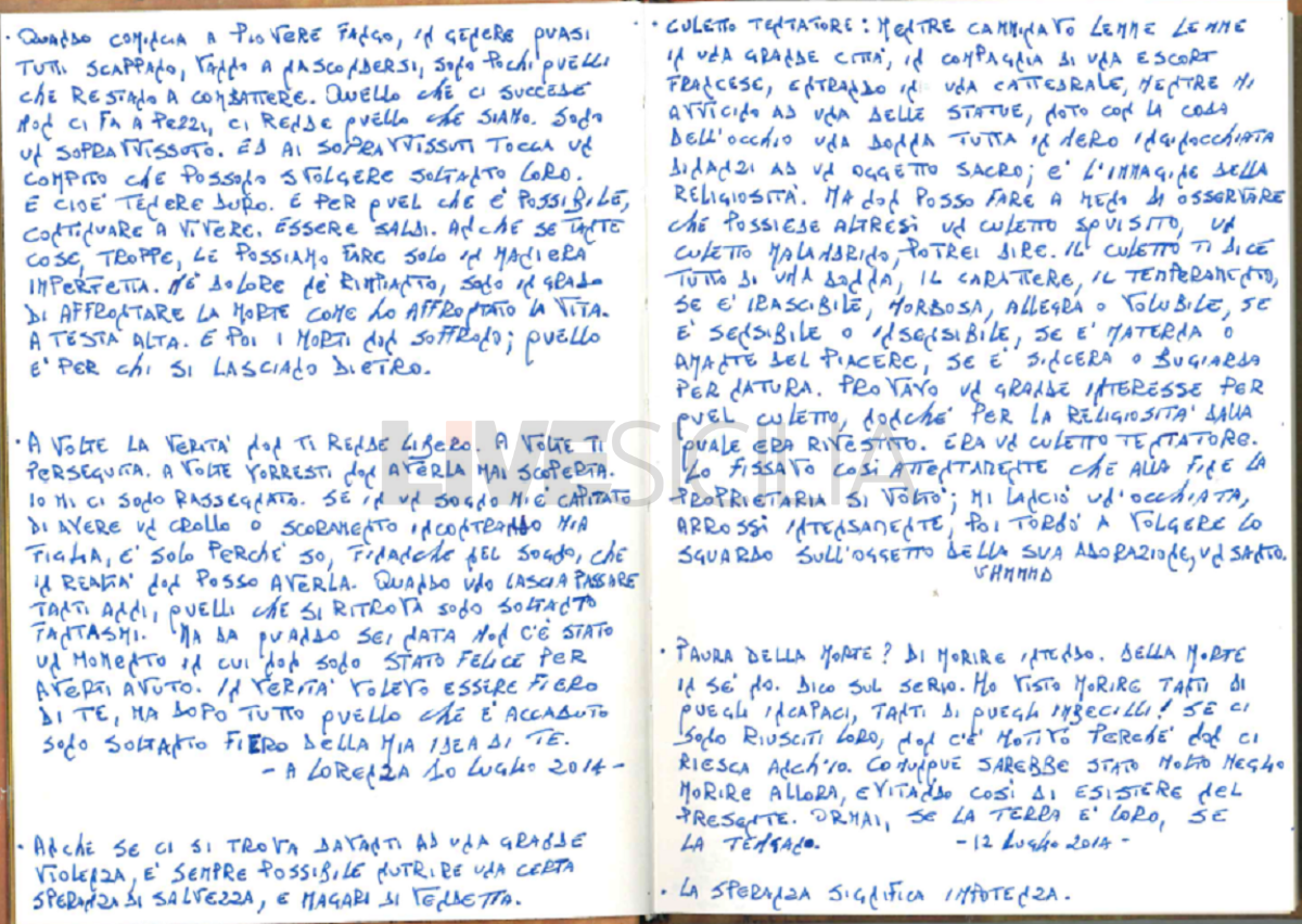Nelle pagine del diario Messina Denaro affronta ripetutamente il tema della morte. Nel luglio del 2014, quindi prima che si ammalasse del tumore che l’anno scorso lo ha ucciso, scriveva: “Sono in grado di affrontare la morte come ho affrontato la vita. Si definisce “un sopravvissuto che non ha paura della morte”. Poi un passaggio in cui fa riferimento ad un viaggio. Non era solo, ma in compagnia di una escort francese. Insieme visitarono una cattedrale, ma il suo sguardo fu catturato da un’altra donna. Si lascia andare ad apprezzamenti volgari. E dire che il diario è destinato alla figlia Lorenza.
