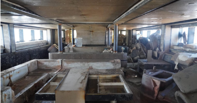Si fa fatica a immaginare com’era il grande salone. Ci si riesce solo mettendo accanto la foto di oggi, ormai che lo yacht è tirato a secco, con quella prima della tragedia del 19 agosto.