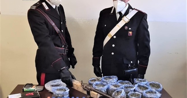 Il sospetto che potessero essere detenute armi o materiali esplodenti e droga ha condotto i militari nella frazione di Cinquegrani, laddove presso l’abitazione del 34enne hanno rinvenuto nel cruscotto di un’autovettura di sua proprietà una scatola di cartone con 9 grammi di infiorescenze di marijuana.