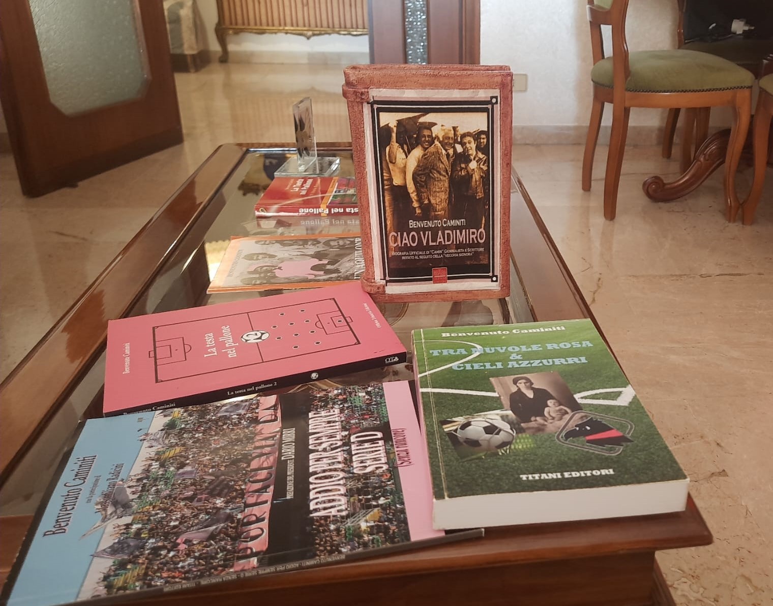 Piccola pausa. La gentilissima Signora Cettina, moglie di Benvenuto, offre cortesemente il caffè. Nel salone, oltre ai libri firmati dallo scrittore-tifoso – un vasto campionario di delizie e di premi – spiccano le foto familiari. Non mancano gli adoratissimi gatti, da tempo accoccolati sul Ponte dell’arcobaleno. Ed è logico che, girando lo sguardo, il discorso finisca sulla famiglia, con i miti del passato.