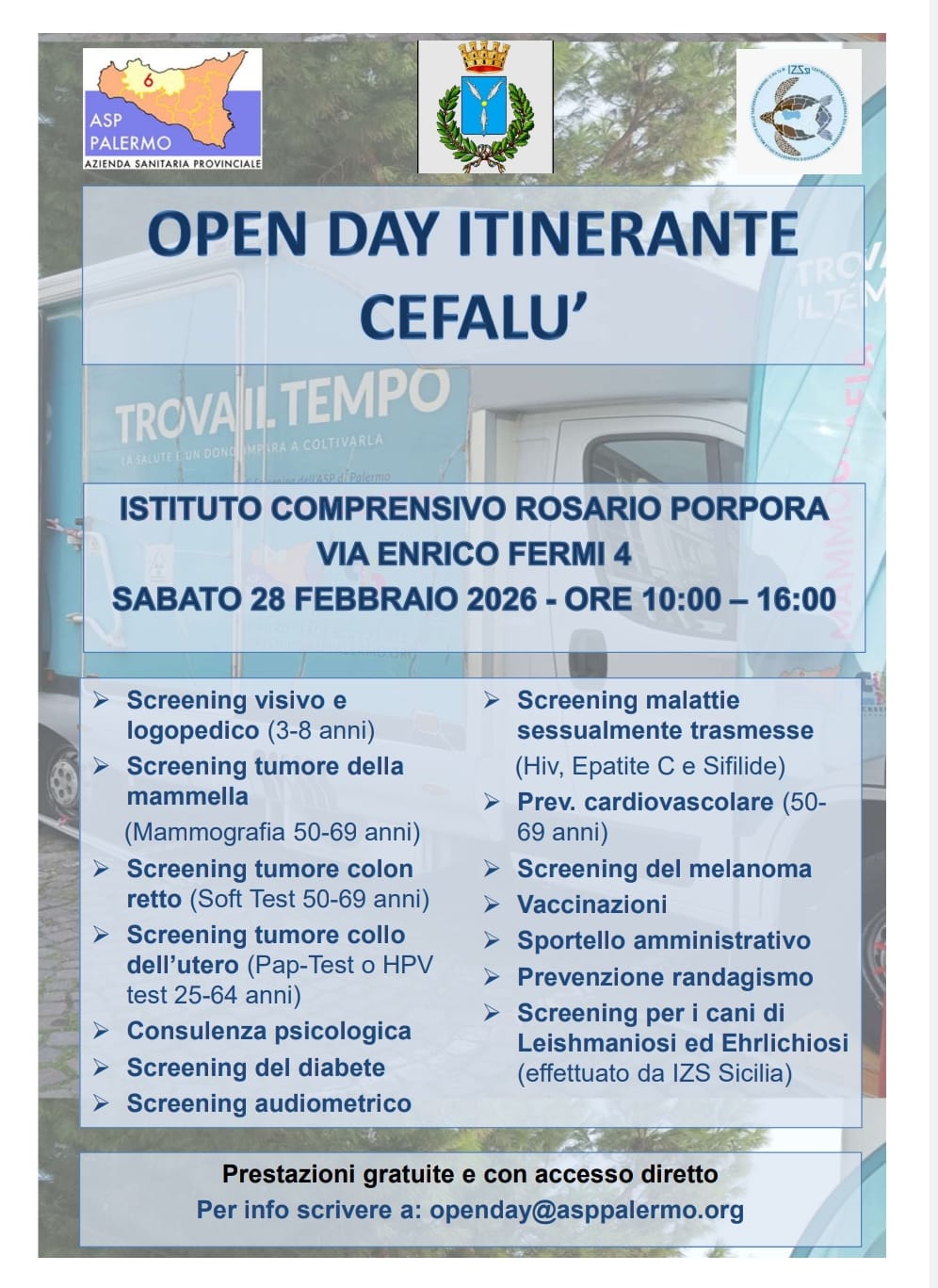L’iniziativa è realizzata in collaborazione con l’amministrazione comunale di Cefalù, con l’Istituto Zooprofilattico Sperimentale della Sicilia e con il supporto dei volontari della I Circoscrizione del Lions Club 108YB Sicilia, del Rotary Club Palermo e dell’Associazione Serena a Palermo. Al centro della giornata gli screening oncologici: mammografia per le donne tra i 50 e i 69 anni, screening del tumore del collo dell’utero per le donne tra i 25 e i 64 anni e screening del tumore del colon retto per la popolazione tra i 50 e i 69 anni. Sarà attivo anche lo screening del melanoma, per la prevenzione dei tumori della pelle.