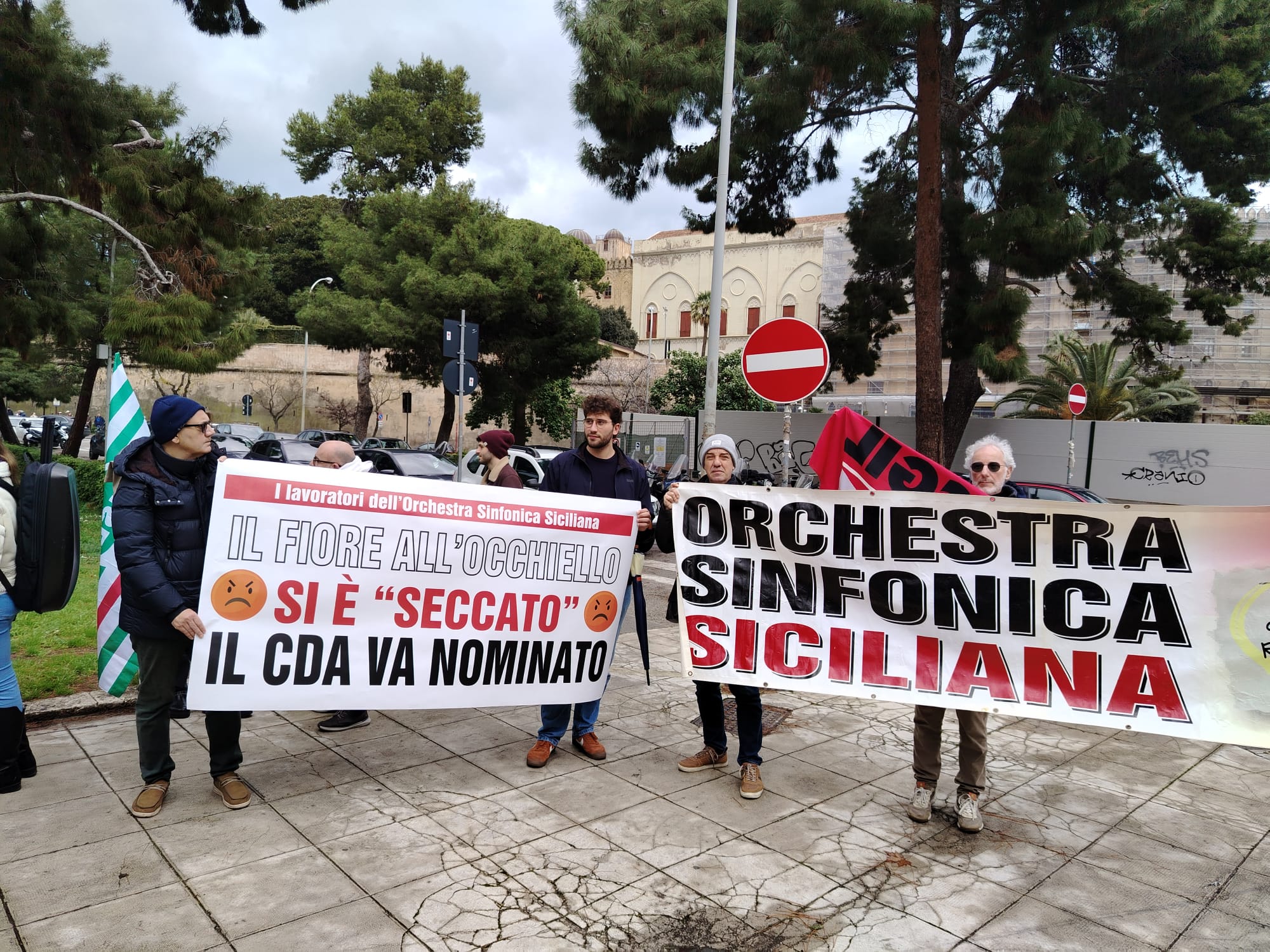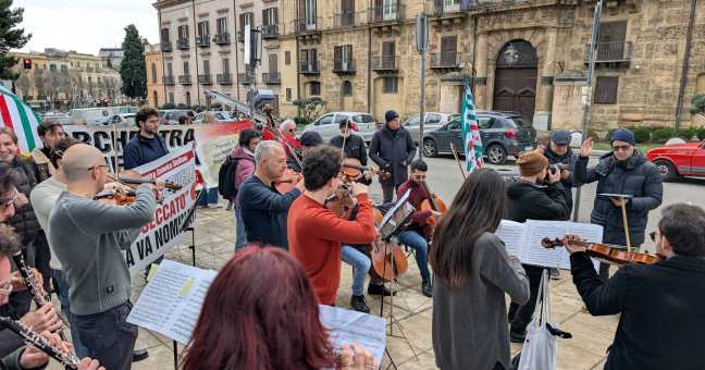 PALERMO – I professori d’orchestra e i lavoratori della fondazione Orchestra Sinfonica Siciliana sono scesi in piazza, nonostante le condizioni meteorologiche avverse, per un sit-in e un concerto di protesta, davanti a Palazzo d’Orleans a Palermo, sede della presidenza della Regione Siciliana.