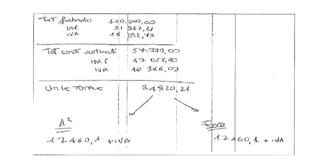 Cifra per la quale, nell’appunto trovato a casa di Alessi, vengono ipotizzate due suddivisisioni: 50% ciascuno per “A” (Al Quadrato srl) e “Fond” (Fondazione Dragotto, anche se i legali di Cannariato, Vincenzo Lo Re, Daniele Livreri e Giada Traina, smentiscono: “La stessa finanza ha analizzato a fondo i conti della società di Alessi, che aveva interamente incassato il contributo pubblico, non riscontrando spostamenti di denaro in favore della Fondazione Dragotto e non evidenziando prelievi in contanti”). Oppure, così c’è scritto nell’altro appunto: 10 mila euro alla Al Quadrato e 24 mila alla Fondazione.